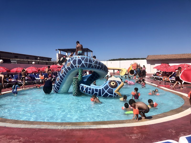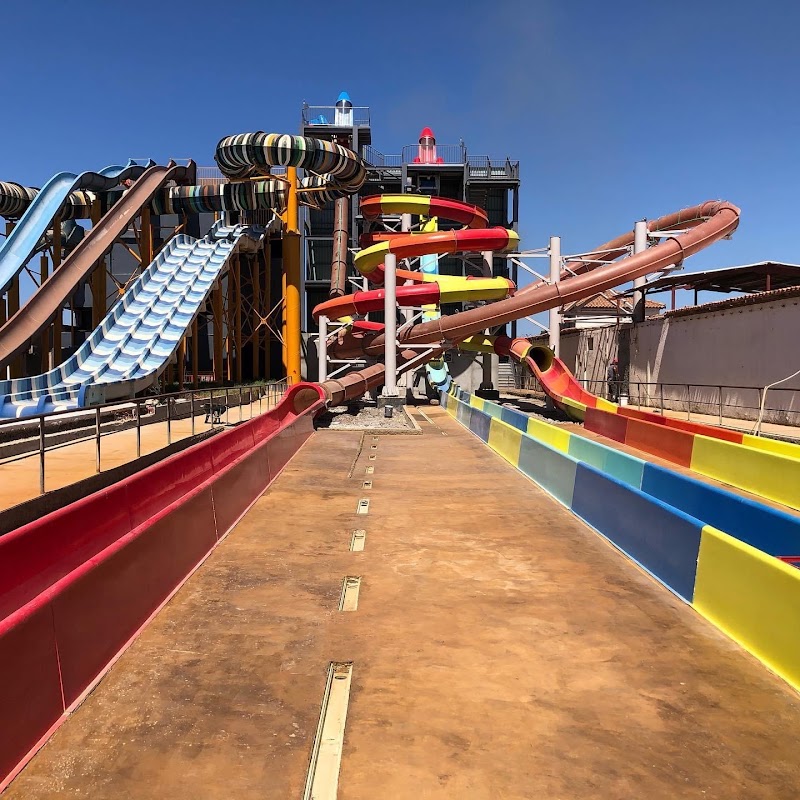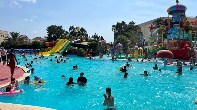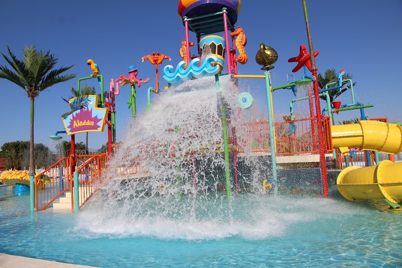 ألعاب مائية ومنزلقات أنبوبية وألعاب الرش بالمياه في مركز ترفيهي ويضمّ مطعمًا مريحًا على منصّات بجوار المسبح